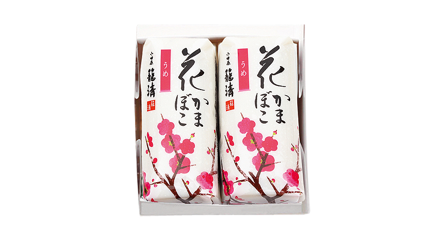 上寒風に吹かれても気高く強く生きる梅。早春の喜びとともに深い味わいをご賞味ください。2本入りでちょっとしたギフトにもおすすめです。「花かまぼこ」は、金太郎飴のように何処を切っても同じ絵柄が出てくる切り出し蒲鉾です。原料には最高級素材であるグチを100%使用しており、季節感あふれる蒲鉾を楽しんでいただけます。